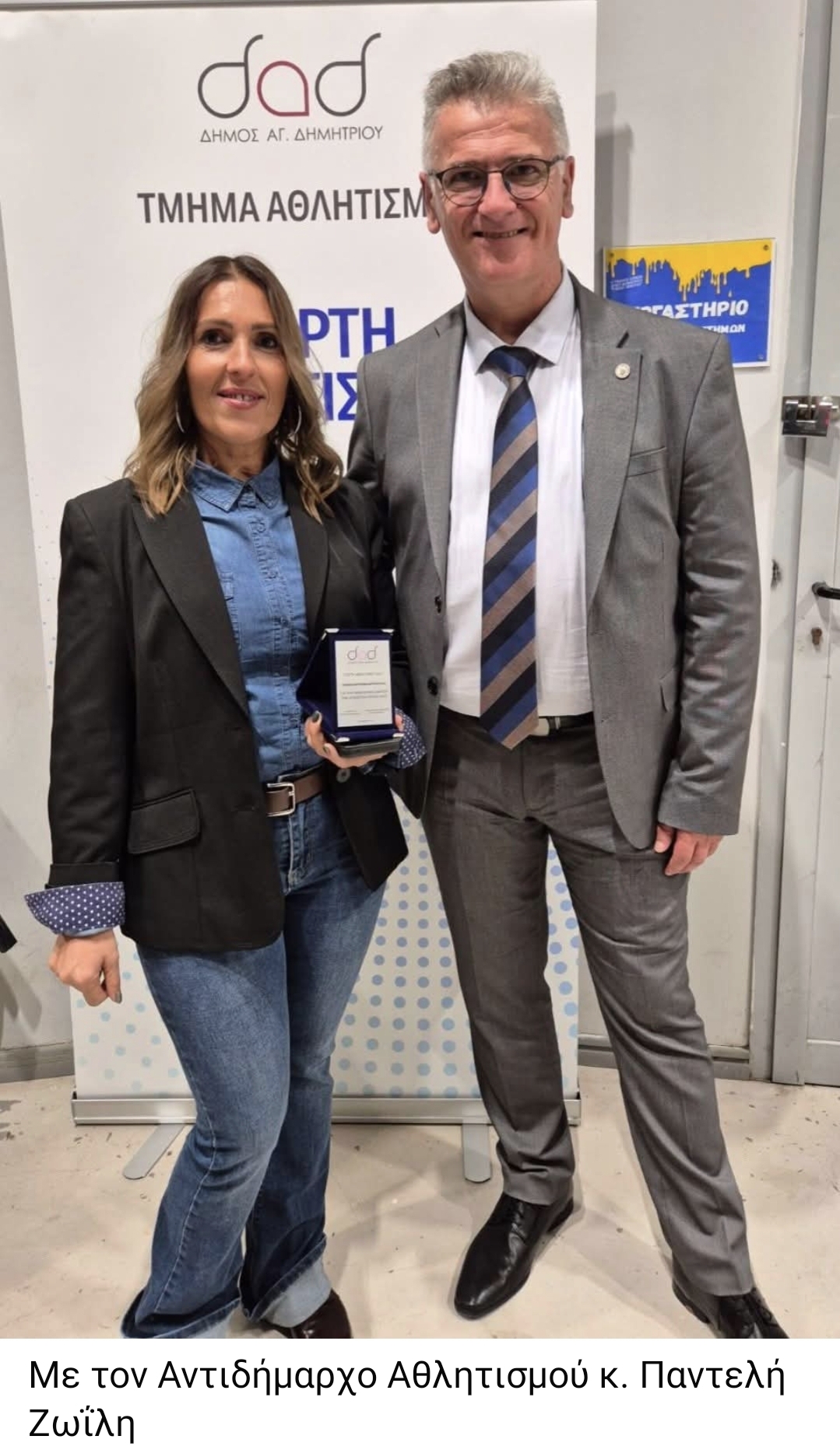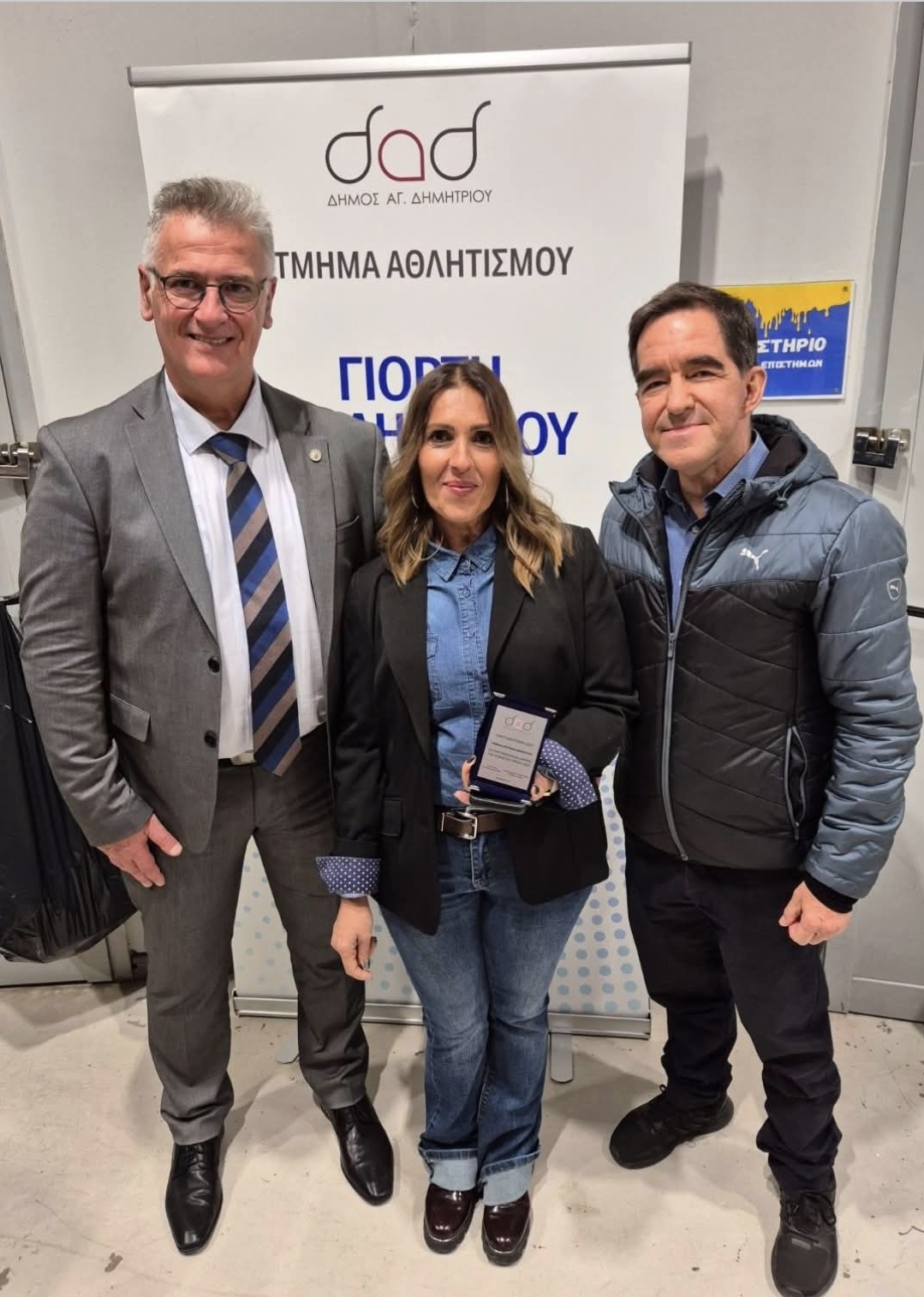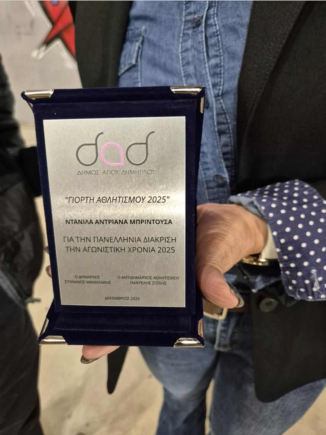 Πολλά συγχαρητήρια στην αθλήτρια μας Ντανίλα Αντριάνα- Μπριντούσα που την Δευτέρα 1 Δεκεμβρίου 2025 βραβεύτηκε από τον Δήμαρχο Αγίου Δημητρίου κ. Στυλιανό Μαμαλάκη και τον Αντιδήμαρχο Αθλητισμού κ. Παντελή Ζωΐλη, για τα 2 χρυσά μετάλλια στα 1.500μ. και 400μ.και 1 ασημένιο μετάλλιο στα 100μ. που κατέκτησε στο Πανελλήνιο Πρωτάθλημα Αθλητική Ομοσπονδία Νεφροπαθών & Μεταμοσχευμένων τον Απρίλιο στην Καλαμάτα.
